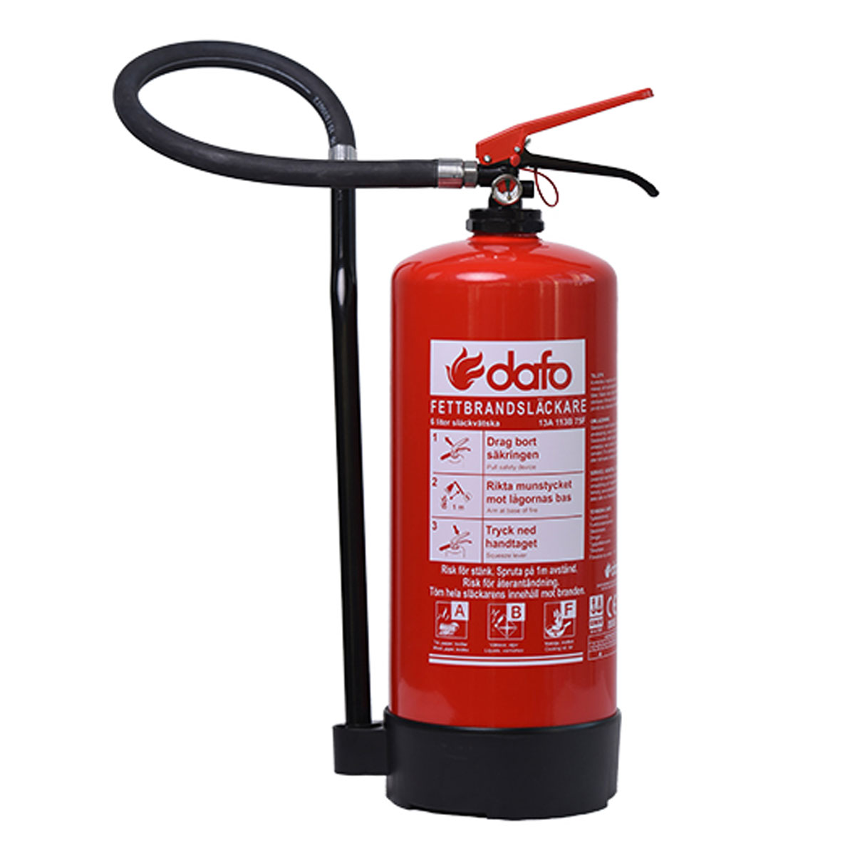 Släckaren är på 6 liter och uppfyller standarden SS-EN 3 och är klassad för släckning av fettbrand.