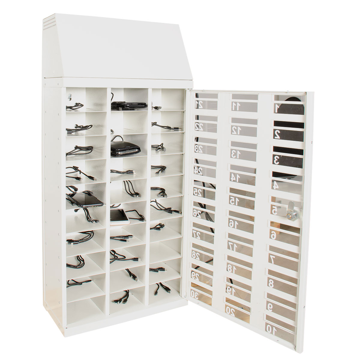En funktionell, låsbar laddplats med 30 fack för laddning av mobiler. Varje laddplats med integrerad laddmöjlighet i 3 varianter (Lightning, Micro-USB, USB-C).