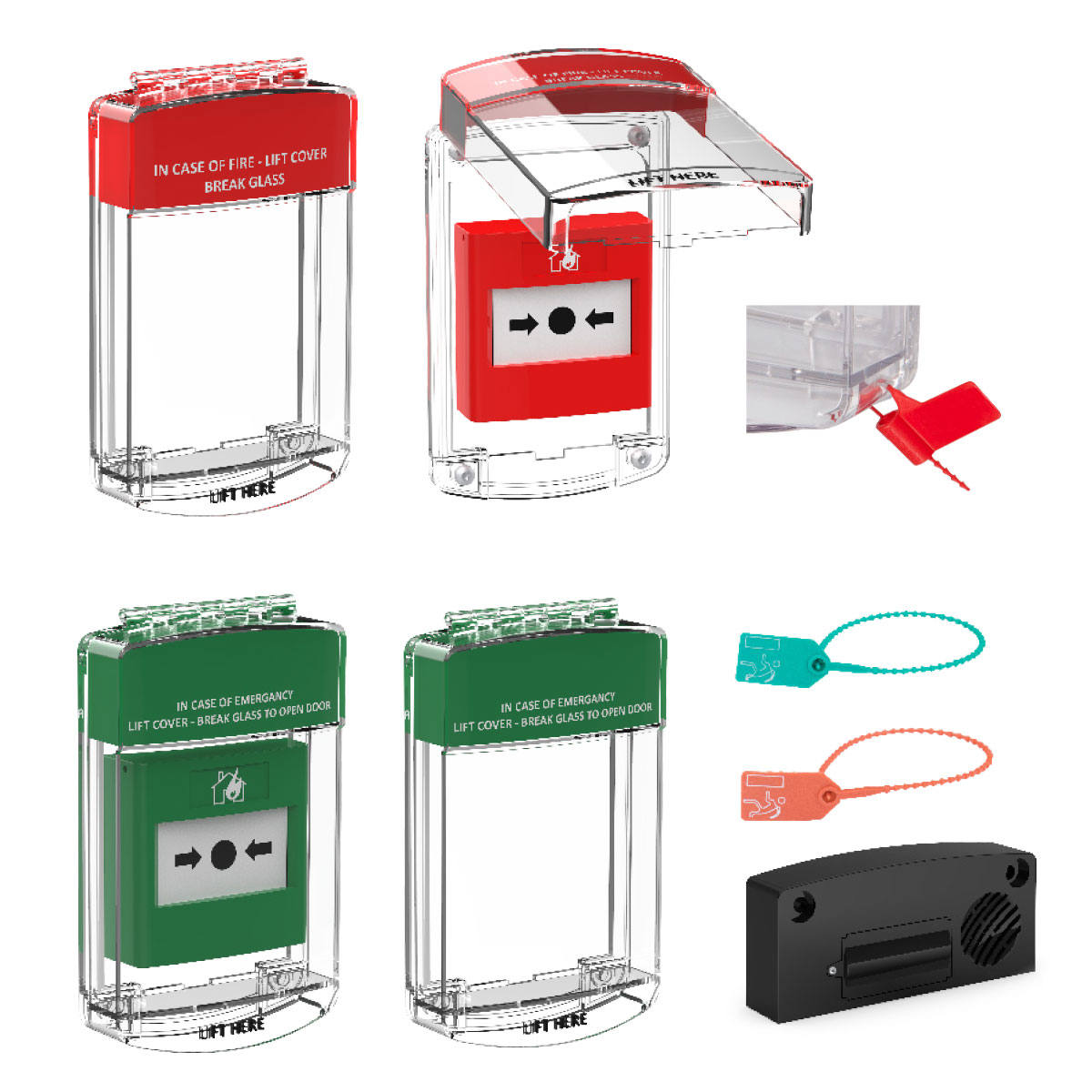 - Skyddskåpan för utrymning visas med monterad larmknapp.